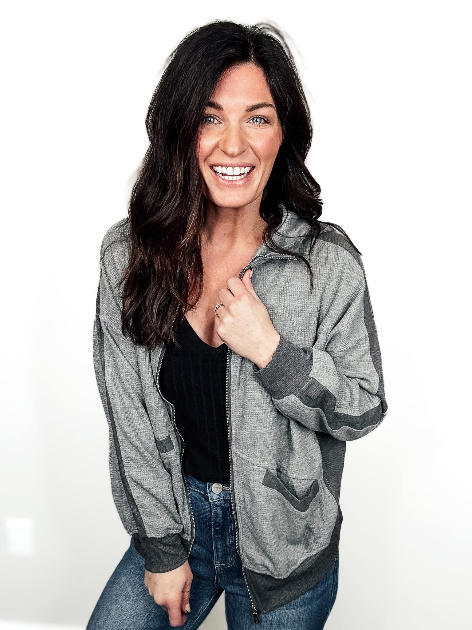 Stay stylishly comfortable on the go with the Cozy Motion Zip-Up, the perfect blend of functionality and laid-back charm. Designed with a textured waffle-knit fabric, this zip-up jacket is soft, lightweight, and breathable, making it ideal for layering year-round. Featuring a relaxed fit with ribbed cuffs, pockets, and a full-zip front, this piece is as practical as it is cozy.